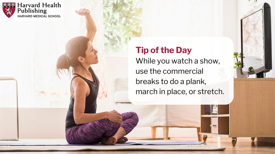 Add more exercise into your day: While you watch a show, use the commercial breaks to do a plank, march in place, or stretch. #HarvardHealth #TipoftheDay https://bit.ly/41Xbvis
