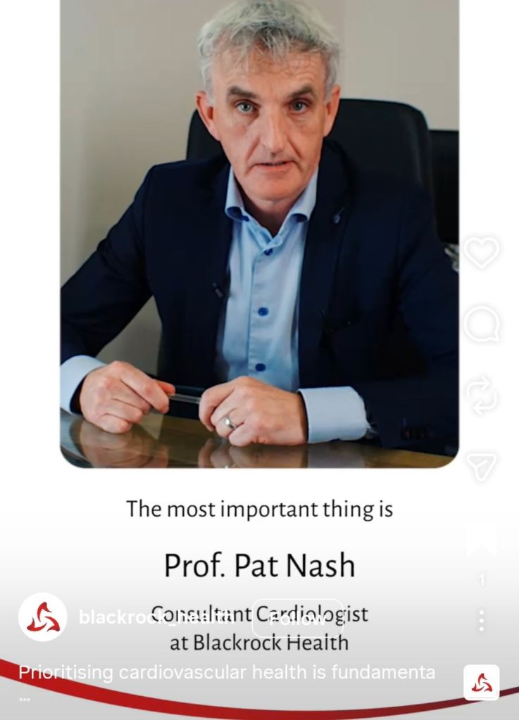 Posted on January 14, 2026January 14, 2026 by Padraic Guilfoyle“People need to be doing 30 minutes of brisk exercise a day” Prof. Pat Nash @blackrock_health #hearthealth ❤️ https://www.instagram.com/reel/DTcwHoClNZx/?igsh=MWI0MWRzODdwMjZ2OQ== Share this: Click to share on X (Opens in new window) X Click to share on Facebook (Opens in new window) Facebook Click to share on Reddit (Opens in new window) Reddit Click to share on Pinterest (Opens in new window) Pinterest Click to share on LinkedIn (Opens in new window) LinkedIn Like Loading...